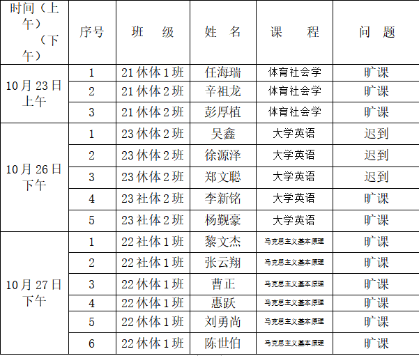 对于教学第三周学风督查情况,公司大部分班级同学都能在规定时间内进入教室,并能在课前十分钟提前进入学习状态,各方面情况良好。但也有极少数班级存在问题。现将在督查过程中遇到的问题进行院内通报如下:旷课(11人)、迟到(3人)、上课玩手机(0人)、上课睡觉(0人)、穿拖鞋(0人)、带早餐(0人)。